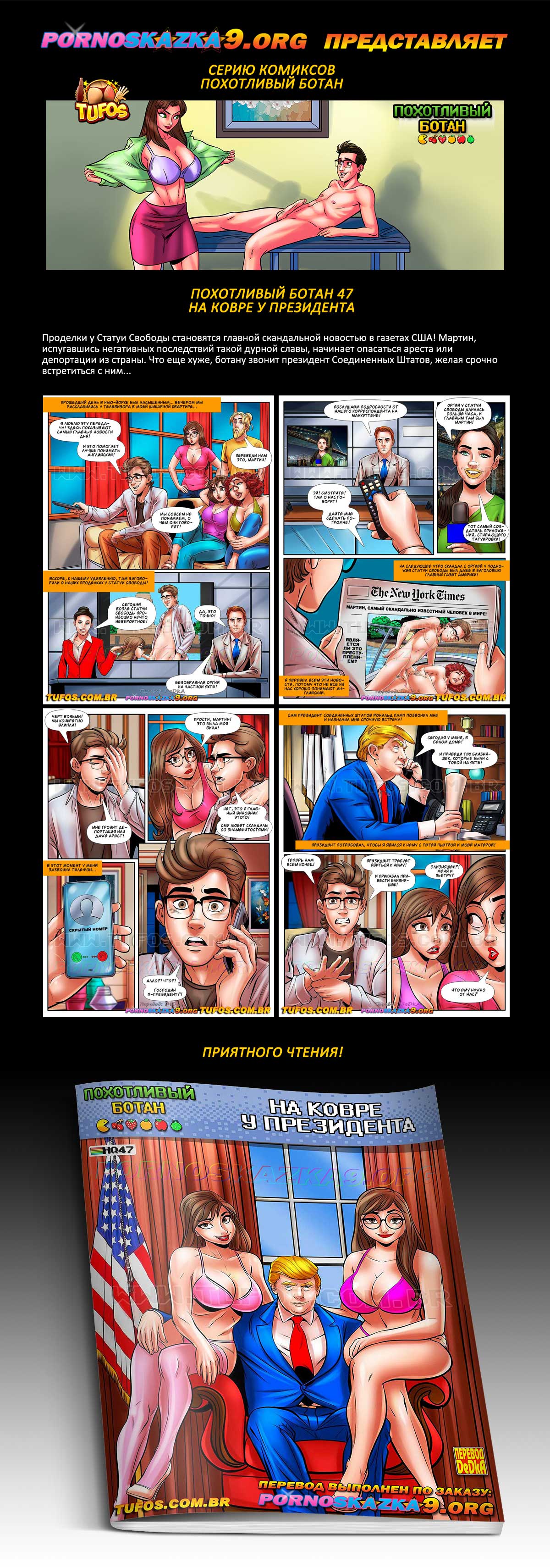Порно комикс Похотливый ботан. Часть 47. На ковре у президента. Проделки у Статуи Свободы становятся главной скандальной новостью в газетах США! Мартин, испугавшись негативных последствий такой дурной славы, начинает опасаться ареста или депортации из страны. Что еще хуже, ботану звонит президент Соединенных Штатов, желая срочно встретиться с ним…